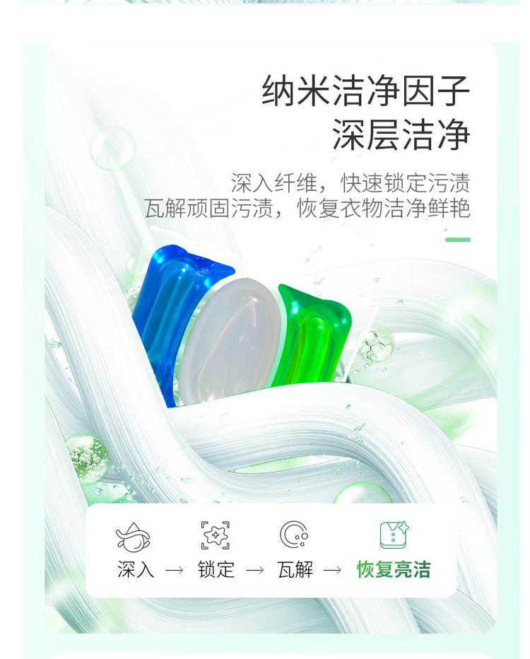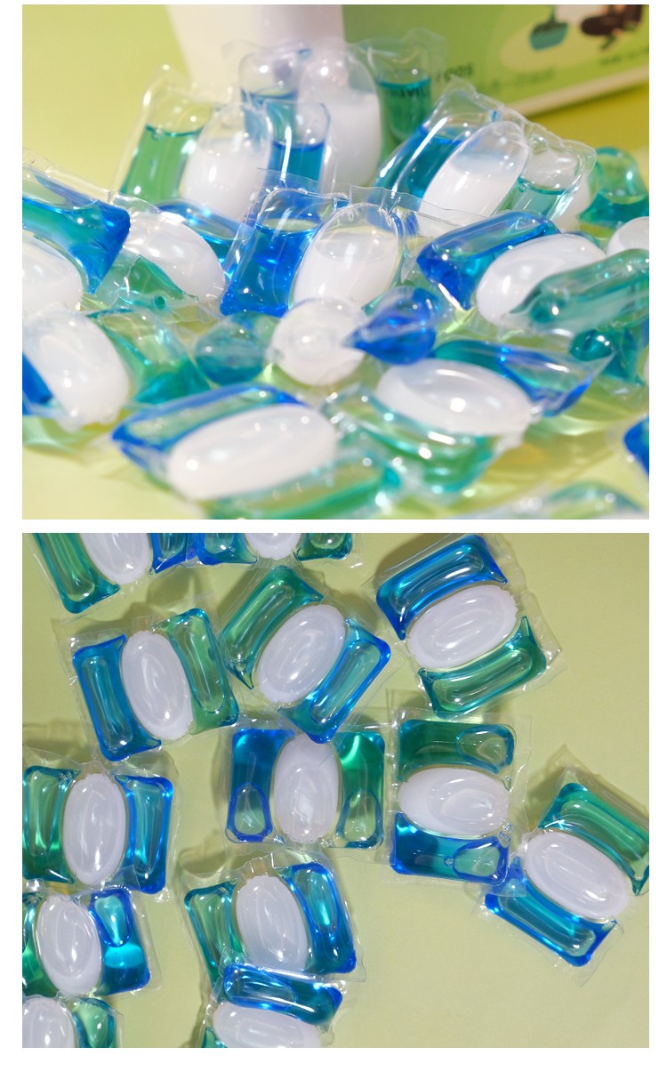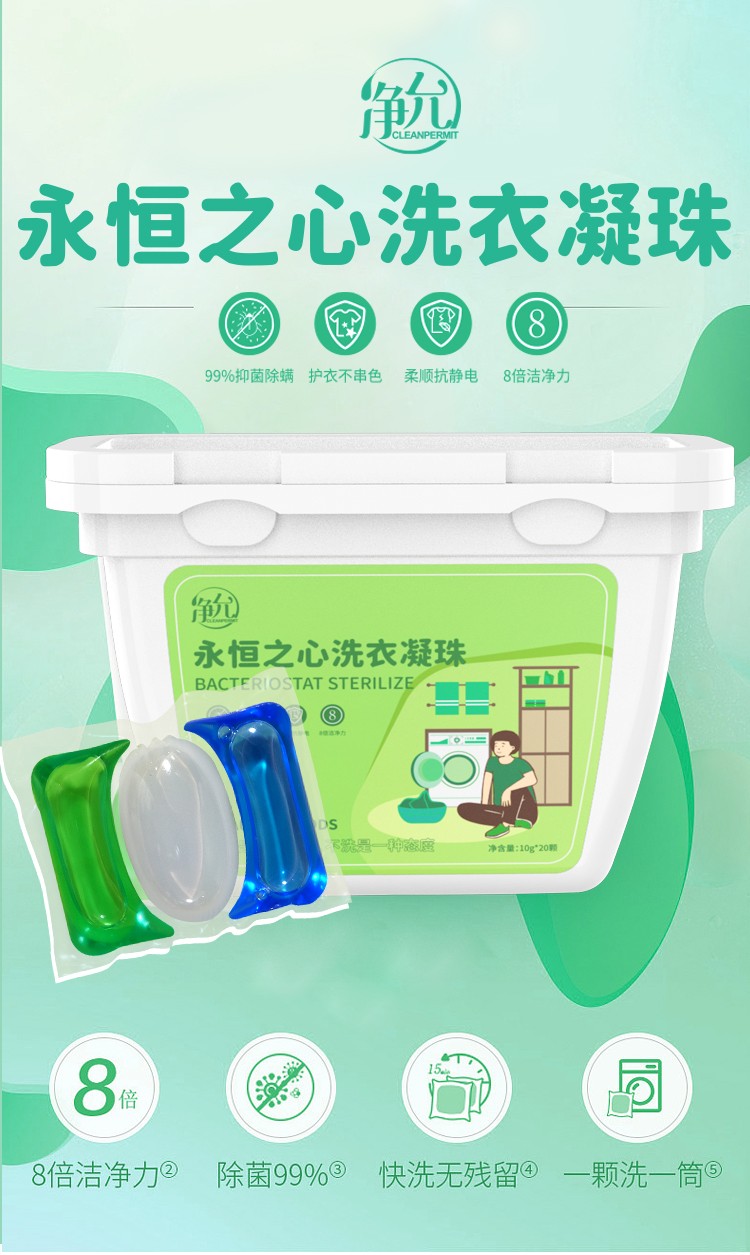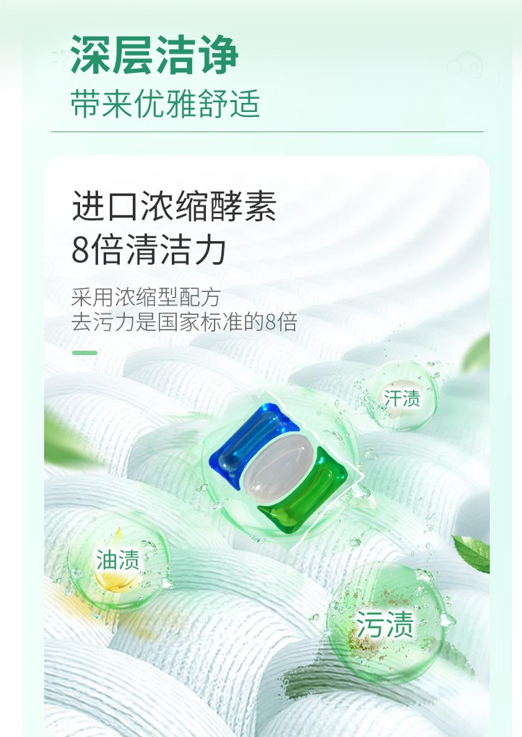 净允系列绿色盒装多效馨香高倍洁净除菌无残留留香柔顺洗衣凝珠