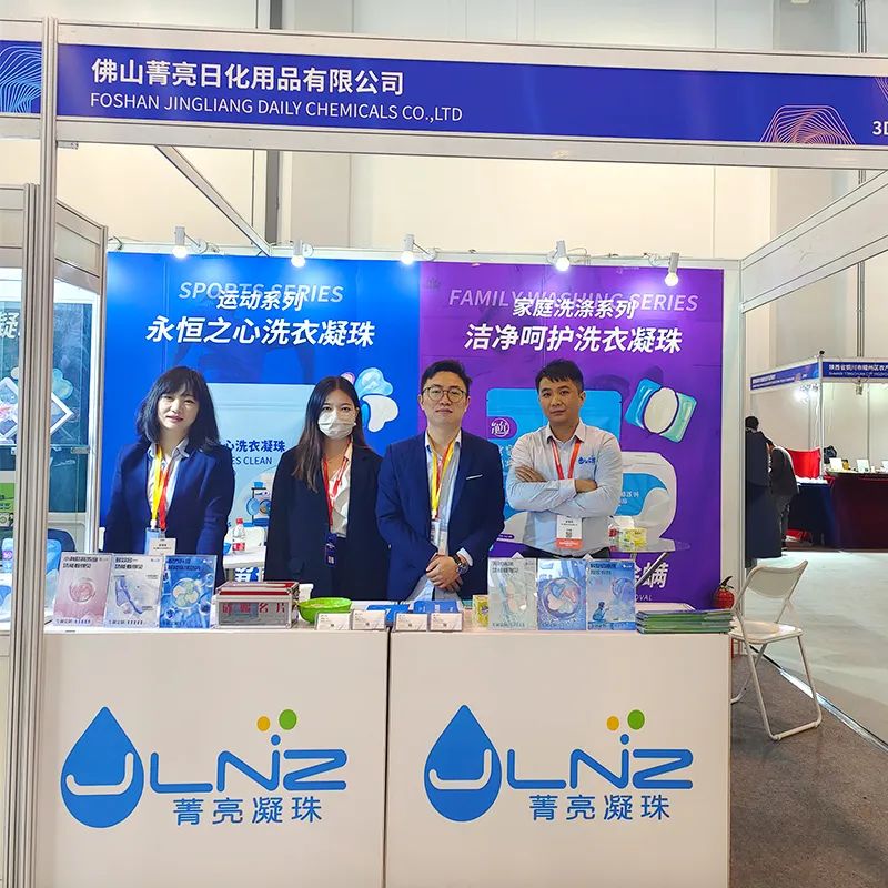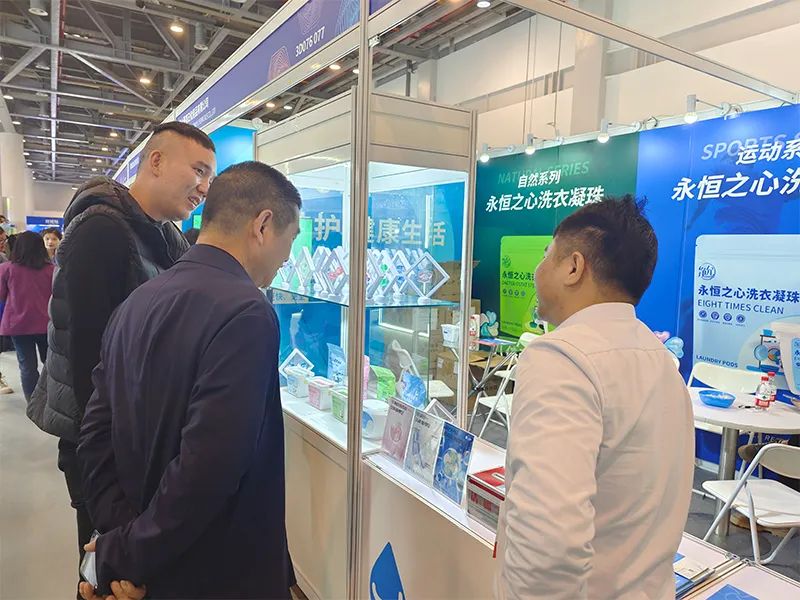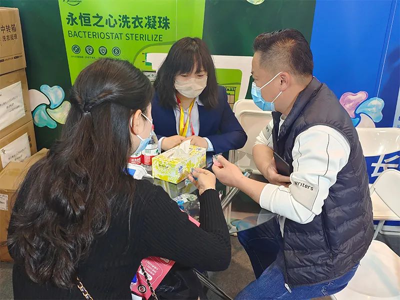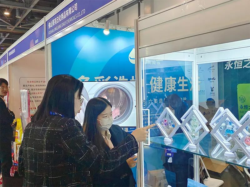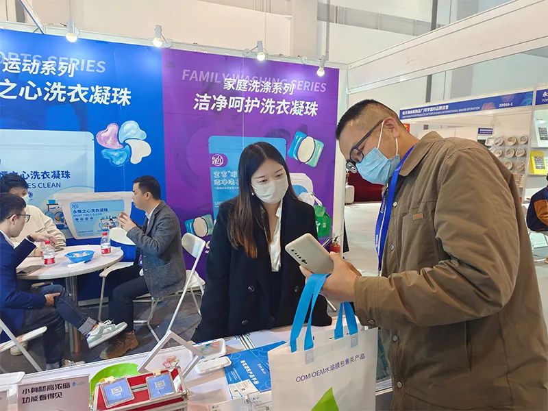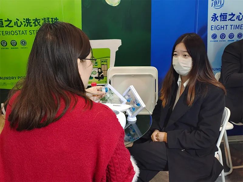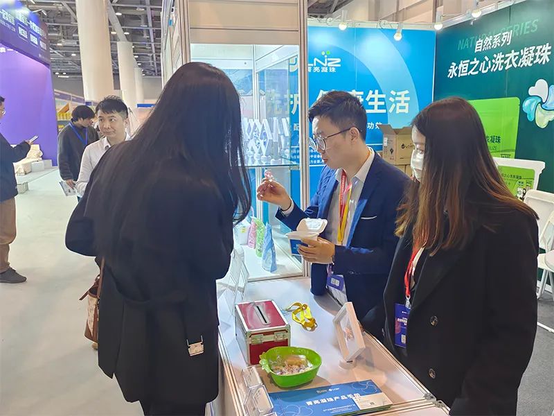 菁亮日化团队的成员们以最佳的精神面貌去向每一位访客介绍公司特色产品,展示菁亮实力。工作人员也细致地为客户们解答洗衣凝珠有关疑问,共同探讨交流。